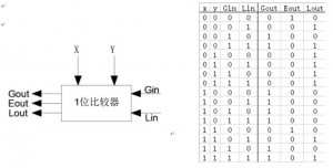 (1)如果X>Y或者X=Y且Gin=1,那么输出Gout为1; (2)如果X=Y且Gin=0和Lin=0,那么输出Eout为1; (3)如果X<Y或者X= Y且Lin=1 ,那么输出Lout为1 。