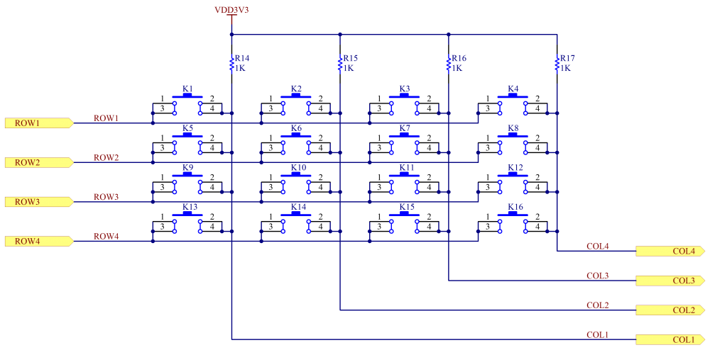 上图为4×4矩阵按键的硬件电路图,可以看到4根行线(ROW1、ROW2、ROW3、ROW4)和4根列线(COL1、COL2、COL3、COL4),同时列线通过上拉电阻连接到VCC电压(3.3V),对于矩阵按键来讲: