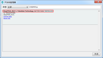 确定后,打开 工具——开发板——开发板管理器,在搜索框中输入“STEPFPGA”会出现名为StepFPGAM10的板卡支持包,点击安装